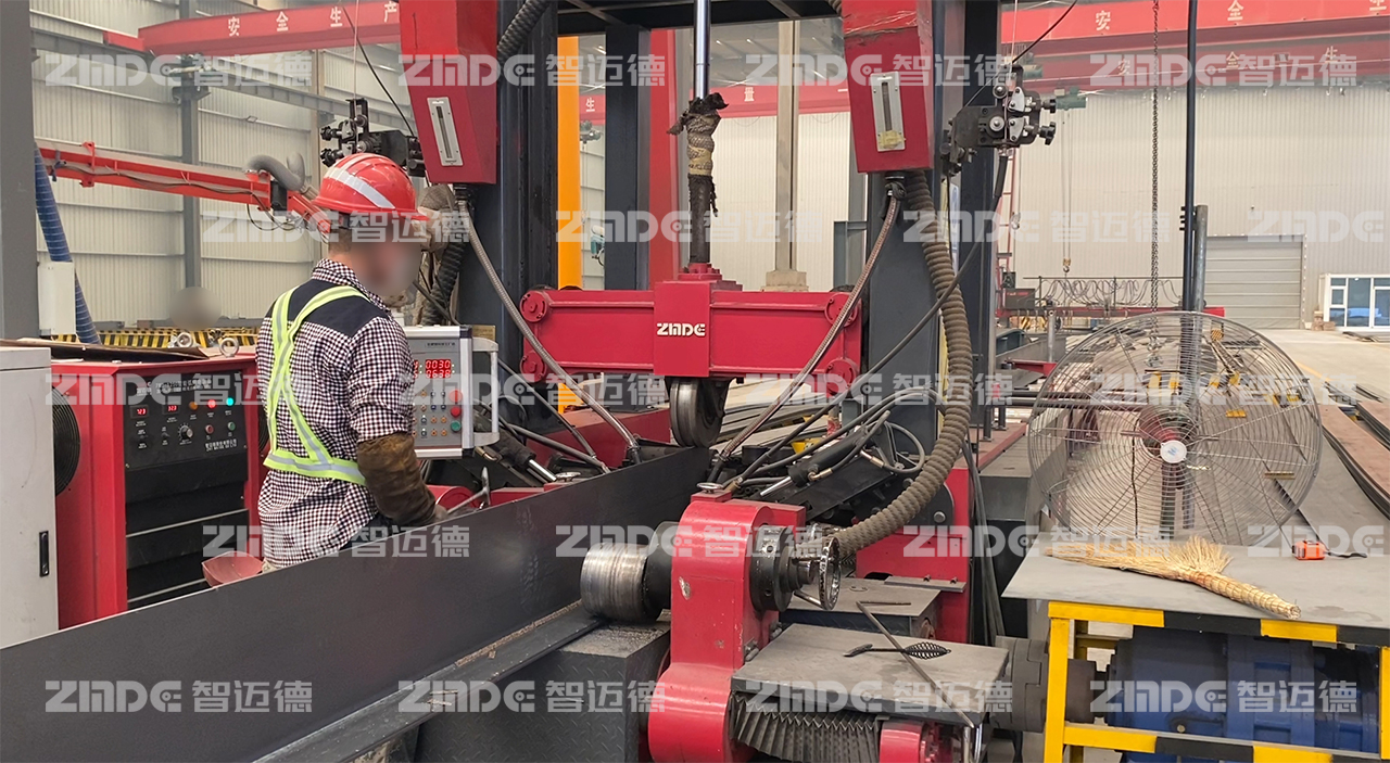 2023年,該鋼構廠與智邁德達成合作,引進一臺裝配式H/T型建筑鋼梁組焊矯一體機。該設備組立、焊接、矯正“三位一體”,一臺設備替代傳統組立機、龍門焊、矯正機三臺設備,僅需1~2人即可操作,降低了人力成本,提高了生產效率。腹板18mm以下免坡口焊接,自動對中,無需點焊,熱焊熱矯,從頭焊到尾,滿足了生產需求,提升了產品品質。